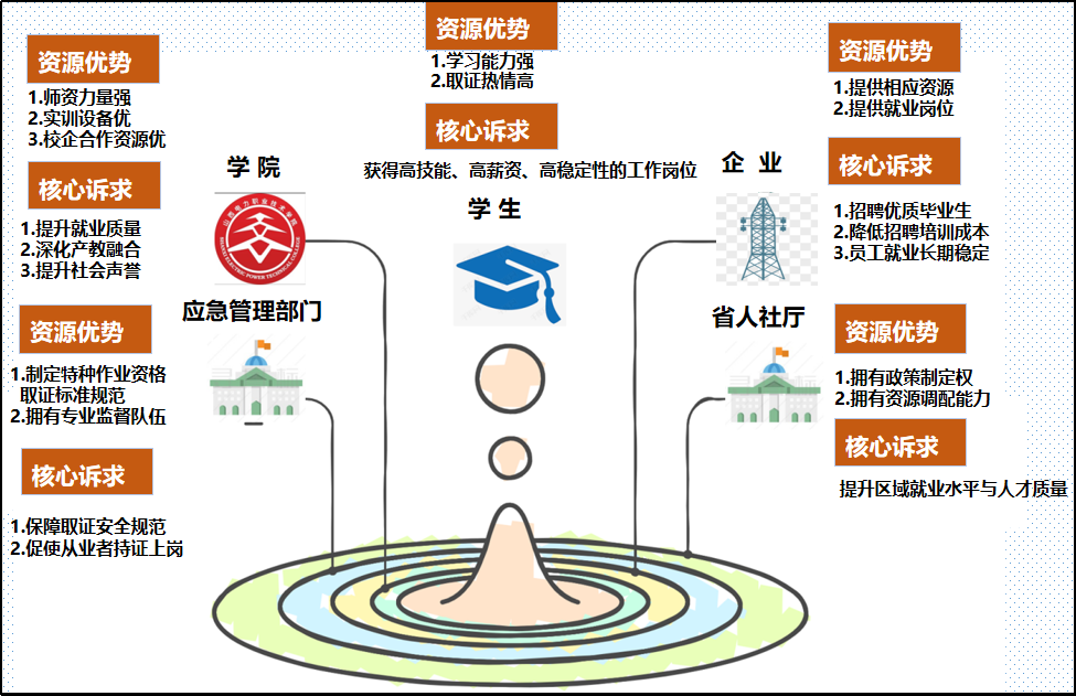 針對上述問題,學(xué)院精準(zhǔn)識別利益相關(guān)方,通過“校政合作取證、校企合作育才、雙線協(xié)同育人”,開辟高技能、高薪資、高穩(wěn)定性的高質(zhì)量就業(yè)新賽道,為電力行業(yè)輸送優(yōu)質(zhì)高技能人才,回應(yīng)“實(shí)現(xiàn)高質(zhì)量就業(yè)”的時代命題。