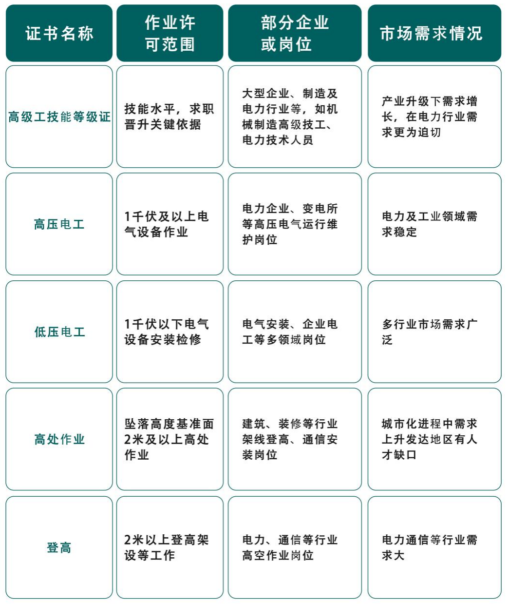 1.明確“取什么證”。通過深入調(diào)研23家企業(yè)及分析省人社廳發(fā)布的電力人才需求數(shù)據(jù),精準(zhǔn)鎖定高級工技能等級證(85%企業(yè)薪資依據(jù))、高壓電工證(電網(wǎng)作業(yè)強(qiáng)制要求)、低壓電工證(需求年增12%)、登高作業(yè)證(高空作業(yè)必備)、高處作業(yè)證(降低事故率60%)。這些均為國家準(zhǔn)入類資質(zhì),覆蓋電力行業(yè)92%崗位需求和80%高危作業(yè)場景,確保學(xué)生獲得的每一項(xiàng)資質(zhì)都能直接提升就業(yè)競爭力和職業(yè)發(fā)展空間。