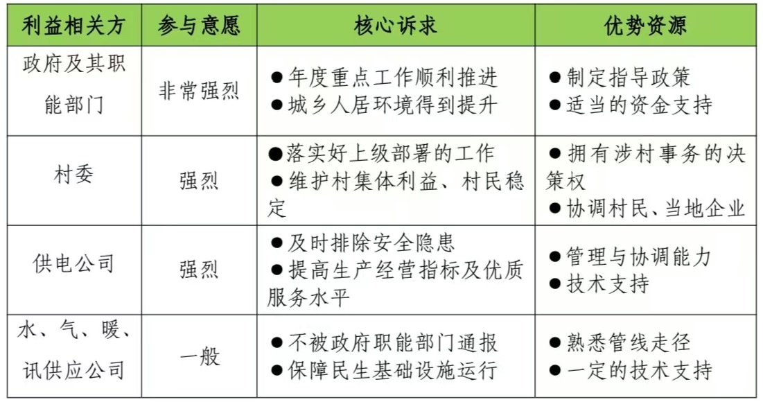 轉(zhuǎn)變以往單打獨(dú)斗的固有工作方式,識(shí)別農(nóng)村配電規(guī)劃建設(shè)有關(guān)的利益相關(guān)方,分析其訴求、資源優(yōu)勢(shì),充分考慮其合理建議、期望和訴求,找到各方利益相關(guān)方的聯(lián)結(jié)點(diǎn),形成“政府主導(dǎo)、供電公司推動(dòng)、水氣暖訊企業(yè)協(xié)同配合、客戶受益、多方共贏”的推進(jìn)模式。